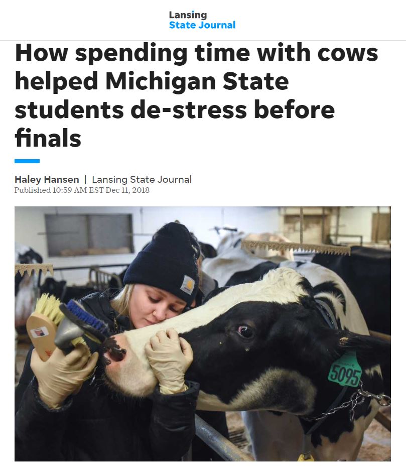 How spending time with cows helped Michigan State students de-stress before finals, Lansing State Journal, December 11, 2018.
