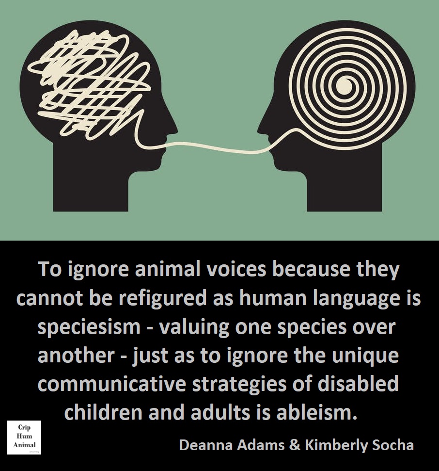 “To ignore animal voices because they cannot be refigured as human language is speciesism – valuing one species over another – just as to ignore the unique communicative strategies of disabled children and adults is ableism.”Deanna Adams & Kimberly Socha