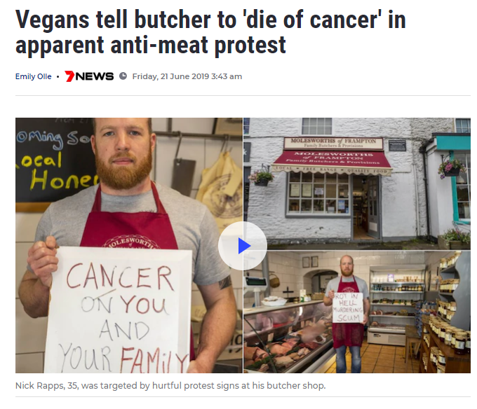 Nick Rapps (35) who runs a butcher shop in Frampton Cottrell (UK), found two protesting signs outside the shop. One sign said: “Cancer on you and your family”. Another written said: “Rot in hell murdering sc*m”.