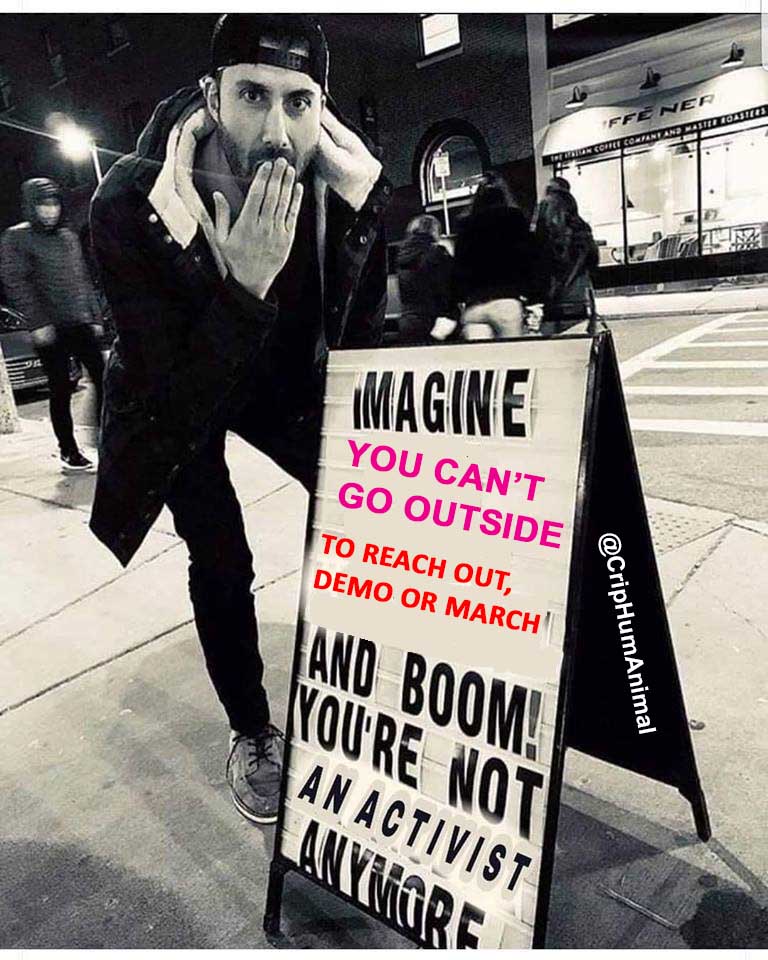 a person with an ‘oh dear’ hand over mouth expression, near a street sign, which reads: “Imagine you ‘can’t go outside, to reach out, demo or march. And boom, you’re not an activist anymore”.