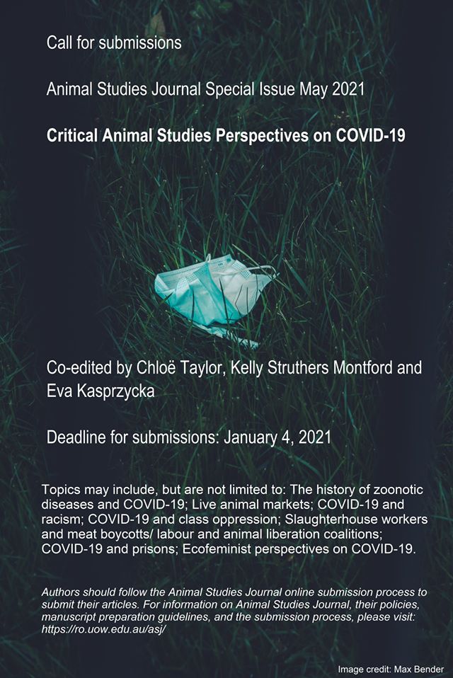 From its genesis to its impacts, animal advocates and critical animal studies scholars have observed that the COVID-19 pandemic, and other zoonotic disease epidemics that have preceded it, highlight the devastating repercussions of human exploitation of other animals, and the interlocking of human and animal oppressions. This special topics issue of Animal Studies Journal will collect critical animal studies scholarship and creative work that explore these connections. Topics may include, but are not limited to:
