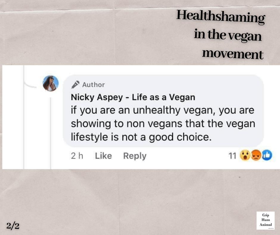 This marginalises chronically ill vegans or vegans whose health is otherwise compromised and also fails to appreciate their activism efforts.