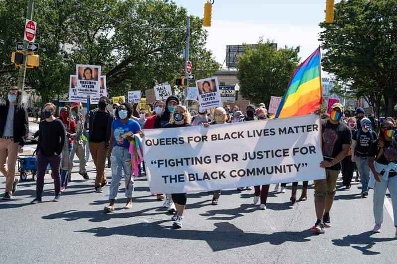 ![[alt txt: Photo of a demonstration, several people marching, holding up signs with the name of Breonna Taylor, one person holding a rainbow flag.