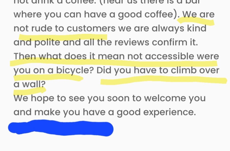 The reply from the restaurant: “We are not rude to customers … Then what does it mean not accessible, were you on a bicycle? Did you have to climb over a wall?”